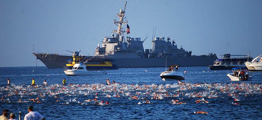 "Island triathlon in Hamilton — ocean swim, coastal ride, and waterfront run in paradise."