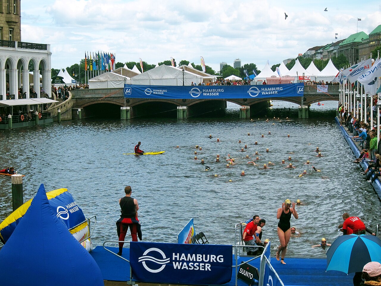 The swim takes place in the Binnenalster — the inner Alster lake that sits in the heart of Hamburg's city centre, surrounded by elegant Hanseatic buildings, shopping arcades, and café terraces. Swimming in the Binnenalster feels like swimming in the city's living room. The water is fresh, calm, and around 19°C in July.
